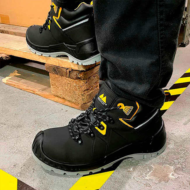 – A sola injetada em PU de dupla densidade com excelente absorção de choque na cor preto e cinza;