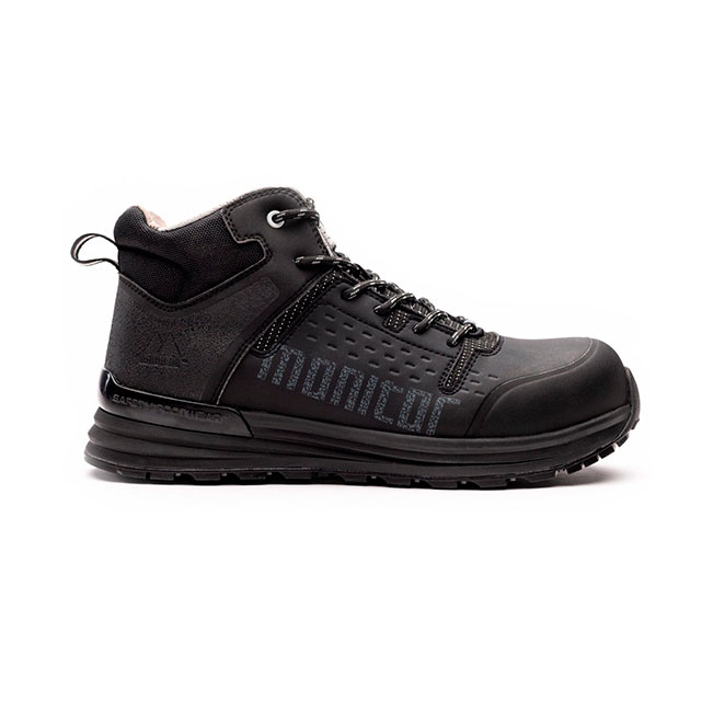 – Língua almofadada têxtil na cor preta com costura branca. Com marcação ESD e símbolo da marca na parte exterior da língua.